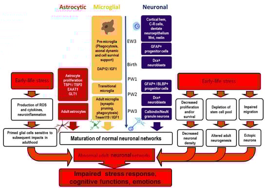 Maturation of neurons and glial cells in the dentate gyrus and effects of early life stress. Early life stress interferes with maturation of both neurons and glia in the DG, resulting in the development of abnormal neural networks in adulthood. These aberrant networks form the basis for perturbed stress response and the development of brain pathologies (cognitive and emotional disturbances), their manifest being potentiated by stressful experiences in later life. BLBP—basic lipid-binding protein, C–R cells—Cajal–Retzius cells, DAP12—DNAX activating protein of 12 kDa, Dcx—doublecortin, EAAT1—excitatory amino acid transporter-1, EW—embryonic week 3, GFAP—glial fibrillary acidic protein, GLT1—glutamate transporter-1, IGF-1—insuline-like growth factor-1, PW—postnatal weeks, Tmem119—transmembrane protein 119, TSP 1 and 2—trombospondines 1 and 2, ROS—reactive oxygen species.