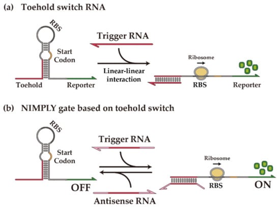 - Kim, J.; Zhou, Y.; Carlson, P.D.; Teichmann, M.; Chaudhary, S.; Simmel, F.C.; Silver, P.A.; Collins, J.J.; Lucks, J.B.; Yin, P.; et al. De novo-designed translation-repressing riboregulators for multi-input cellular logic. Nat. Chem. Biol. 2019, 15, 1173–1182. [Google Scholar] [CrossRef]