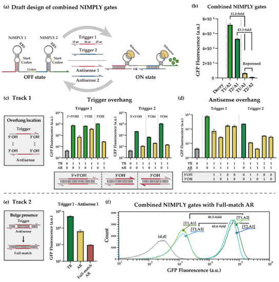 - Hong, S.; Jeong, D.; Ryan, J.; Foo, M.; Tang, X.; Kim, J. Design and evaluation of synthetic RNA-based incoherent feed-forward loop circuits. Biomolecules 2021, 11, 1182. [Google Scholar] [CrossRef]