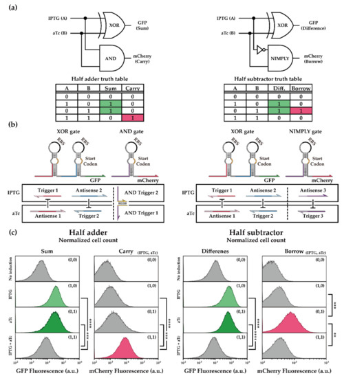 - Wong, A.; Wang, H.; Poh, C.L.; Kitney, R.I. Layering genetic circuits to build a single cell, bacterial half adder. BMC Biol. 2015, 13, 40. [Google Scholar] [CrossRef] [PubMed]