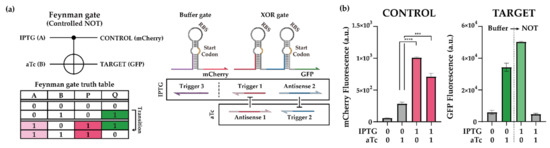 - Weinberg, B.H.; Pham, N.T.H.; Caraballo, L.D.; Lozanoski, T.; Engel, A.; Bhatia, S.; Wong, W.W. Large-scale design of robust genetic circuits with multiple inputs and outputs for mammalian cells. Nat. Biotechnol. 2017, 35, 453–462. [Google Scholar] [CrossRef]