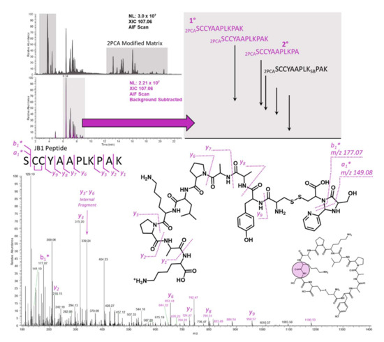 Use of the approach outlined in Figure 3 enabled rapid and simple interpretation of the soft spot for the JB1 and somatostatin peptides. As mentioned earlier, targeted methods for cyclic peptides in soft spot identification can benefit immensely from a priori knowledge of the m/z values of interest. Surveying the parent, primary hydrolysis product, and 2PCA conjugate masses over the time course facilitates an understanding of the proteolytic picture for the cyclic peptide. Principally, one can confirm that parent reduction over time correlates with an increase in the singly hydrolyzed product(s), and one can confirm that the derivatization efficiency is sufficient for tandem MS sequencing. Simultaneously, monitoring the formation of the 107.0609 m/z imidazolidinone-specific product ion in an AIF format allows the user to overlay the targeted method with the 2PCA method, and confirm that the 2PCA modification is, in fact, on the analyte and not on a matrix peptide. The utility of the AIF scan with background subtraction is demonstrated in Figure 4. Background subtraction has been used extensively for metabolite identification experiments [16,17,18,19,20], and even in the context of AIF [17]. This precedent method enables rapid discrimination between 2PCA conjugates that are present on matrix molecules and those that are present on the actual cyclic peptide analyte of interest. The selectivity of 2PCA is for α-amines, which are present on the N-terminus of all non-acetylated intact proteins and all internally formed peptides (that have not undergone N-terminal side cyclization). For intact proteins, proteomic studies in yeast and humans have observed that a very high proportion of proteins are acetylated (57% in yeast and 84% in humans) [21], and this is thought to happen co-translationally on the nascent polypeptide chain [22]. Peptides that are formed via proteolysis of matrix proteins by matrix proteases are a much greater concern. This becomes especially important with the harsh matrices that are used for achieving maximal stability. Figure 4 shows the utility of background subtraction for the JB1 peptide analysis by separating out the true 2PCA modified analyte peaks (Figure 4, bottom XIC) from those peptides that are generated from the matrix alone (Figure 4, top XIC). Zooming in on the background subtracted XIC for the diagnostic ion shows several peaks that represent not only the cyclic peptide soft spot but also secondary metabolites that have undergone a subsequent hydrolysis step, in this case clipping of the C-terminal Lysine residue.