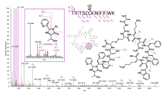 - Foreman, D.J.; Parsley, N.C.; Lawler, J.T.; Aryal, U.K.; Hicks, L.M.; McLuckey, S.A. Gas-Phase Sequencing of Cyclotides: Introduction of Selective Ring Opening at Dehydroalanine via Ion/Ion Reaction. Anal. Chem. 2019, 91, 15608–15616. [Google Scholar] [CrossRef]