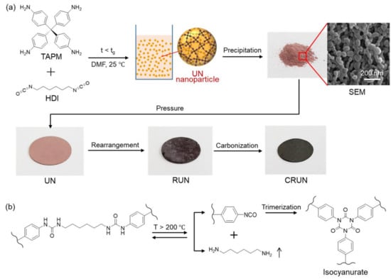 The polyurea network (UN) [,], prepared from cross-linking polymerization of an aromatic tetra-amine and an aliphatic diamine, has been reported to show thermal rearrangement chemistry, comprising the dissociation of the urea bonds to amines and isocyanates, and the trimerization of isocyanates into cyclic isocyanurate rings [,,]. During the process, micro- and mesopores are generated via the expulsion of aliphatic moieties. The rearranged polyurea network (RUN) contains many isocyanurate nodes that are resistant to high temperatures up to 500 °C.