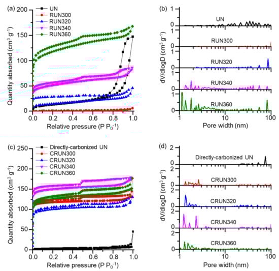 The change in pore characteristics in the transformation of RUNs to CRUNs. (a) N2 adsorption–desorption isotherms of the RUNs and a UN. (b) NLDFT pore distribution curves of the RUNs and a UN. (c) N2 adsorption–desorption isotherms of the CRUNs and a directly carbonized UN. (d) NLDFT pore distribution curves of the CRUNs and a directly carbonized UN.
