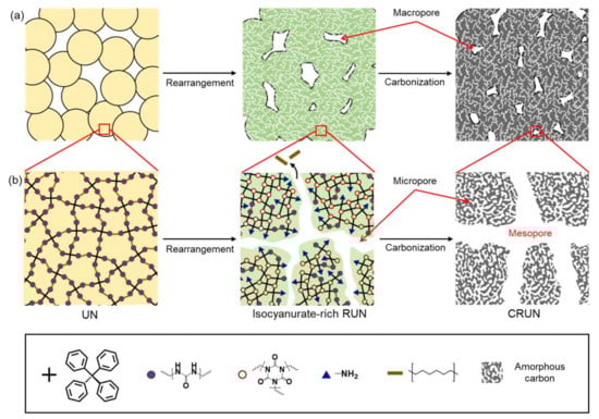 Based on the above results, the mechanism for creating hierarchical pores in CRUN is proposed, as depicted in Figure 5. The molded UN only has macropores in the gaps between the particles (Figure 5a). The macropores are maintained in the sintering and carbonization processes. Micropores and mesopores are developed via the evaporation of alkyl moieties during the thermal rearrangement into RUN (Figure 5b). The rearrangement process generates the RUN rich in thermo-stable isocyanurate nodes. The isocyanurate-rich RUN sustains the high carbonization temperature, although the pore sizes increased via further loss of weak organic moieties, giving the CRUN. The micropores are additionally generated via the formation of amorphous carbon [].