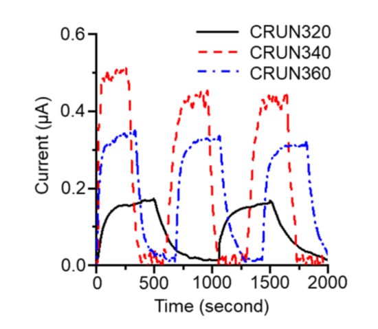 The CRUN monoliths’ excellent carbon dioxide adsorption and electrical conductivity were utilized to investigate how their porosity affects their gas transport rates. We monitored the current change in the carbon monolith occurring with carbon dioxide adsorption and desorption []. The experimental setup is given in Figure S1. As shown in Figure 6, the current increased upon purging carbon dioxide into the cell and decreased upon purging nitrogen. Three CRUN samples, with different porosities (Table S2), were employed in the test. CRUN 340 exhibited the biggest and fastest current change in response to the change in atmosphere. While the amount of current change should reflect the total surface area of the CRUN, the rate of current change must be related to the rate of gas transport through the pore structure. It appeared that the average times to current saturation after switching to carbon dioxide were 143, 108, and 278 s for the CRUN320, CRUN340, and CRUN360, respectively. The results indicate that the hierarchical porosity, with a high mesopore ratio, of the CRUN340 facilitated gas diffusion.