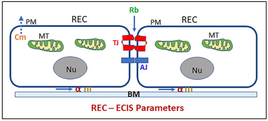 Diagram showing ECIS parameters in the retinal endothelial cell (REC). Rb: paracellular resistance between RECs; α: basolateral resistance between REC and the extracellular matrix; Cm: cell membrane capacitance. MT: mitochondria; PM: plasma membrane; Nu: nucleus; TJ: tight junction; AJ: adherens junction; BM: basement membrane.