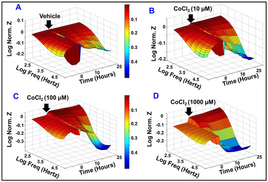 Three-dimensional plots of the log of normalized impedance (Z) across HRECs against time and the log of the alternating-current (AC) frequency applied to the ECIS electrode. The control vehicle or different CoCl2 treatment were added at the time (t) = 0, which was 44.8 h after culturing HRECs on the ECIS electrode. After treatment, Zt was tracked for 25 h, where Z0 at t = 0 was used to normalize all other Z measurements, such that each reading was calculated as the log of the ratio of Zt/Z0. The maximum value is when Zt = Z0 (hence the ratio becomes 1, and the log equals 0). Abbreviations: Z: impedance; Norm: normalized; Freq: frequency; Zt: the impedance at time t; Z0: the impedance at time 0.