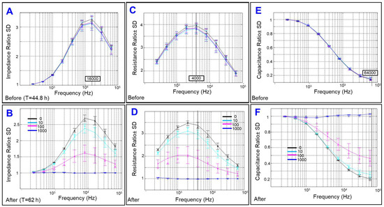 Regarding the frequency dependence spectrum of the R (Figure 3C), it showed that at a frequency of 4000 Hz, a maximum R ratio between wells with HRECs versus those without cells was obtained, providing the broadest possible range for the comparison between post-CoCl2-treatment groups (Figure 3D). Therefore, this frequency was chosen for subsequent R analysis. Lastly, the frequency dependence spectrum of C (Figure 3F) showed a frequency of 64,000 Hz to give a broadest possible range to compare the C among different CoCl2-treatment groups and thereby was utilized in the subsequent C analysis.