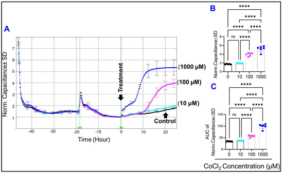 (A) Normalized capacitance of HREC groups vs. time at a frequency of 64,000 Hz. Different concentrations of CoCl2 were applied at t = 0. Experimental groups are control, 10 µM CoCl2, 100 µM CoCl2, and 1000 µM CoCl2. (B) Statistical analysis of each group’s normalized capacitance at the end of the experiment (t= 25 h). (C) Statistical analysis of each group’s area under the normalized capacitance curve between the interval t = 0 and t = 25 h. The ANOVA test followed by the Tukey post-hoc test was used for statistical comparison between the experimental groups. Abbreviations: Norm: normalized; AUC: area under the curve. **** p ≤ 0.0001; ns: no significance.