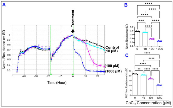 (A) Normalized resistance of HREC groups over time, using a frequency of 4000 Hz. Treatments were applied at t = 0, and resistance measurements were taken starting from placing HRECs onto the ECIS electrode until 25 h after treatment application. HREC experimental groups are control (0), 10 µM CoCl2, 100 µM CoCl2, and 1000 µM CoCl2. (B) Statistical analysis of each group’s normalized resistance at the end of the experiment, at t = 25. (C) Statistical analysis of each group’s area under the normalized resistance curve for the interval between t = 0 and t = 25. Statistical analysis was performed using the ANOVA test followed by the Tukey post hoc test. Abbreviations: Norm: normalized; AUC: area under the curve. ** p ≤ 0.01; *** p ≤ 0.001; **** p ≤ 0.0001.