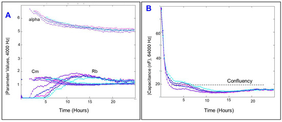 (A) Deconvolution of the total resistance across the HRECs into three separate components: α, the resistance between the cells and their basolateral substrate; Rb, the resistance paracellularly; and Cm, cell plasma membrane capacitance. The α, Rb, and Cm of HRECs were measured at 4000 Hz during the first 25 h after culturing HRECs onto the electrodes. (B) The capacitance of HRECs vs. time at 64,000 Hz was measured for 25 h after the first culture of HRECs onto the electrodes; n = 5.