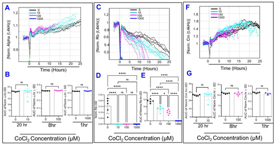 (A) Normalized α vs. time from the time of treatment to t = 25 h post-treatment. (B) Areas under the α curves for the intervals when the α value can be modeled in each group. CoCl2 treatment is associated with no α changes from control in each of the groups along the interval for each when their alpha values were able to be calculated (t = 0–20 h for the 10 µM, t = 0–8 h for the 100 µM, and t = 0–1 h for the 1000 µM). (C) Normalized Rb vs. time curves. (D) Bar chart of each group’s normalized resistance at t = 25 h. (E) Areas under the normalized Rb curves from t= 0–25 h. ANOVA test followed by Tukey post hoc test for all groups demonstrates how Rb responds to CoCl2 in a dose-dependent manner over the experimental duration, with an inverse relationship between CoCl2 concentration and Rb AUC. (F) Normalized Cm vs. time curves. The ECIS is unable to calculate a real value for Cm at time points when Rb is at or below zero. (G) Areas under the normalized Cm curves for the intervals when the Cm value can be modeled in each group. CoCl2 treatment is associated with no Cm changes from control in each group along the interval for each their Cm values can be calculated (t = 0–20 h for the 10 µM, t = 0–8 h for the 100 µM, and t = 0–1 h for the 1000 µM). Statistical analysis was performed using the ANOVA test followed by the Tukey post hoc test. Abbreviations: Norm: normalized; AUC: area under the curve; ns: no significance; *: p ≤ 0.05; ****: p ≤ 0.0001; n = 5–6/group.