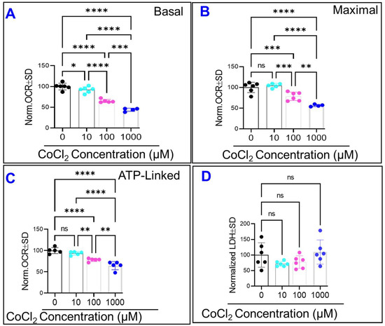 To verify that the adverse effects of CoCl2 on HREC barrier function were associated with mitochondrial dysfunction, cellular oxygen consumption rates (OCRs) were analyzed using a Seahorse flux bioanalyzer (XFe96, Agilent, Santa Clara, CA, USA) and Mito-Stress test. First, as shown in Figure 8A, all tested concentrations of CoCl2 dose-dependently and significantly reduced HRECs’ basal OCRs, normalized by subtracting non-mitochondrial OCRs (corresponding to rotenone/antimycin-insensitive OCRs). Second, the ATP synthase inhibitor (oligomycin) was added to separate OCRs linked to ATP production by subtracting resultant OCRs from basal OCR. As shown in Figure 8B, only 100 and 1000 µM of CoCl2 lowered ATP-linked OCRs in HRECs significantly and in a dose-dependent manner compared to control. Third, the addition of protonophore uncoupler (FCCP) stimulated OCRs to their maximal activities in both control and CoCl2-treated HRECs but to a significantly lower extent in 100 and 1000 µM CoCl2-treated cells (Figure 8C). These results confirmed that all CoCl2 tested concentrations impaired mitochondrial respiratory function under basal conditions, creating a cytopathic hypoxia-like condition.