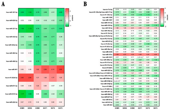 Analysis of differentially expressed (DE) miRNAs in GDM vs. NGT patients of the discovery cohort. Hierarchical clustering analysis of the DE miRNAs in total plasma (A) and EVs (B) of GDM (n = 3) and NGT (n = 3) patients demonstrates the miRNAs different expression pattern between the two subgroups.