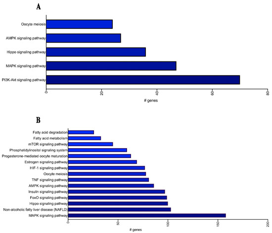 Enrichment analysis of differentially expressed (DE) miRNAs in GDM vs. NGT patients of the discovery cohort. Enrichment analysis of DE total plasma (A) and EVs-miRNAs (B) was performed with KEGG and demonstrates the involvement of a number of DE total plasma and EVs-miRNAs in GDM signaling pathways.