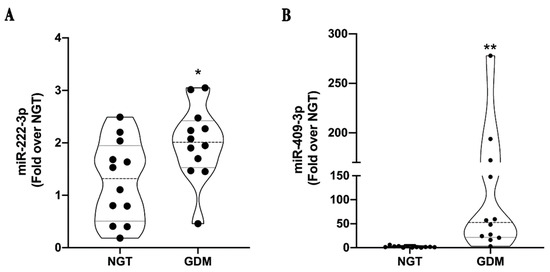 RT-qPCR analysis of miR-222-3p and miR-409 in the validation cohort. RT-qPCR was used to analyze miR-222-3p (A) and miR-409-3p (B) in the total plasma compartment of the GDM (n = 12) and NGT (n = 12) validation cohort. The analysis confirmed the upregulation of these two miRNAs in GDM patients vs. NGT subjects. Significance was calculated with GraphPad Prism software by using the two-tailed t-test and calculating the difference between the mean of GDM vs. NGT ± standard error of the mean (SEM). * p < 0.05, ** p < 0.01.