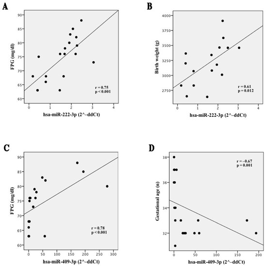 Interestingly, the expression of circulating miR-222-3p was positively correlated to fasting plasma glucose (FPG) (p < 0.001) and birth weight (p = 0.012) (Figure 4A,B), whereas the expression of circulating miR-409-3p was significantly directly correlated to FPG (p < 0.001) and inversely correlated with gestational age (p = 0.001) (Figure 4C,D).
