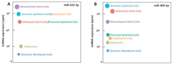 An in-silico analysis with the evaluation of the expression of miR-222-3p and miR-409-3p in different cell types was performed. These miRNAs are highly expressed in mesenchymal stem cells and also enriched in pregnancy-related cell types, such as embryonic stem cells, amniotic epithelial cells, and placental epithelial cells (Figure 5A,B and Supplementary Tables S4 and S5).