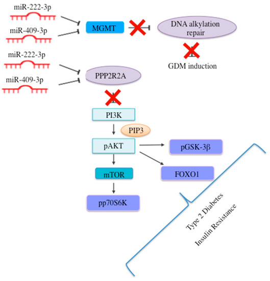 The overview of literature data and of the expression of miR-222-3p and miR-409-3p together with their validated targets allowed to hypothesize the putative role of these miRNAs in the pathophysiology of GDM, as summarized in Figure 6.