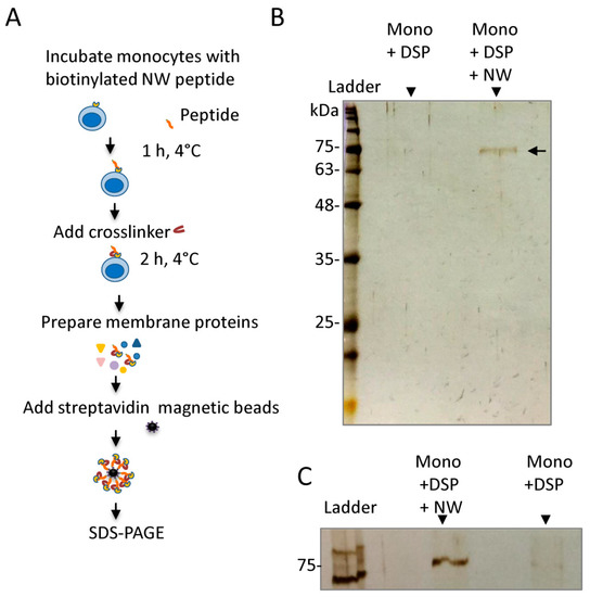 Using phage display technology, we identified a series of peptides that bind to human monocytes and macrophages. Among the identified peptides, a peptide named NW binds with high affinity to human monocytes and macrophages [22]. To identify the NW binding receptor(s), we first used a chemical cross-linking methodology [23,24]. The benefit of cross-linking on live cells is that the peptide–receptor interaction can be captured in its native environment, which avoids the risk of the receptor losing structure during cell lysis. In these experiments, freshly isolated blood monocytes were incubated with the biotinylated NW peptide, washed to remove unbound peptides, and then incubated with DSP, a chemical cross-linker. Subsequently, membrane proteins were prepared and the biotinylated NW peptide–receptor complexes were captured using streptavidin-conjugated magnetic beads, as illustrated in Figure 1A. Analysis of the captured proteins with SDS-PAGE followed by silver staining identified a unique protein band that was enriched in the sample co-incubated with the NW peptide and DSP (Figure 1B,C). The protein band was cut from the gel and its identity determined by mass spectrometry. Of the identified proteins, human albumin displayed a high probability, with the highest number of exclusive peptides and high sequence coverage.