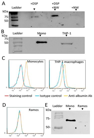 Albumin is present in pulled-down proteins and on the cell surface of monocytes/macrophages. (A) After cross-linking, proteins in cell lysates were pulled down by streptavidin magnetic beads and then analyzed by Western blotting using an anti-albumin monoclonal antibody. Lane 1, monocytes incubated with only DSP; Lane 2, monocytes incubated with the NW peptide and DSP; Lane 3, monocytes incubated with only NW peptide. (B) Analysis of membrane proteins by Western blotting. Membrane proteins from monocytes and THP-1 macrophages were prepared and analyzed by Western blotting using an anti-albumin monoclonal antibody. (C,D) Representative histograms showing the analysis of surface albumin by flow cytometry in monocytes, THP-1 macrophages, and Ramos cells. (E) Analysis of membrane proteins by Western blotting using an anti-albumin monoclonal antibody. (A–E) The results presented are representative of at least three independent experiments. DSP, Dithiobis(succinimidyl propionate); Mono, Monocytes; kDa, Kilodaltons.