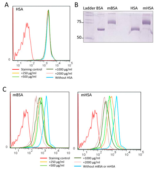Effects of unmodified and modified albumin on NW peptide binding to monocytes. (A) Unmodified albumin does not compete with the NW peptide binding. Monocytes were pre-incubated with various concentrations of unmodified human serum albumin (HSA) prior to the addition of NW peptide, staining, and analysis by flow cytometry. (B) Analysis of maleic-anhydride-modified albumin by SDS-PAGE. HSA and bovine serum albumin (BSA) were modified by maleic anhydride as described in the Section 4 and then analyzed by 10% SDS-PAGE followed by Coomassie blue staining. Unmodified HSA and BSA were included as controls. (C) Maleic-anhydride-modified albumin competes with the NW peptide binding to monocytes. Monocytes were pre-incubated with various concentrations of modified albumin before being stained with the NW peptide and analyzed by flow cytometry. The data shown in (A,C) are representative of at least eight independent experiments. m, Modified.
