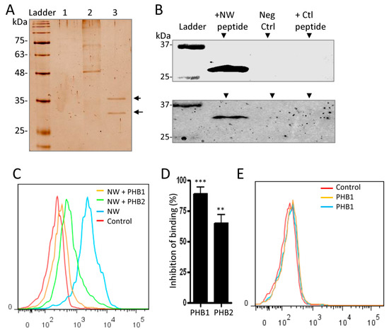 NW peptide binds to prohibitins. (A) Proteins in whole-cell protein lysates were incubated with the biotinylated NW peptide or the control peptide, and peptide-binding proteins were pulled down by streptavidin magnetic beads and analyzed by SDS-PAGE followed by silver staining. Protein lysates incubated with only streptavidin-magnetic beads served as an additional control. Lane 1, proteins incubated with beads; Lane 2, proteins incubated with the control peptide; Lane 3, proteins incubated with the NW peptide. Two bands within the range of 35 to 25 kDa were detected in Lane 3. (B) Analysis of the pulled-down proteins by Western blotting. Experimental conditions are as in (A). Proteins were electrotransferred to nitrocellulose membranes and probed with a monoclonal antibody against PHB1 or PHB2 protein. Neg Ctrl, negative control (no peptide was added to the protein extracts). (C) Prohibitins inhibit the binding of the NW peptide to monocytes. The NW peptide (0.010 μg) was pre-incubated or not with prohibitins (3 μg each) for 30 min at RT before being added to monocytes and analyzed by flow cytometry. (D) Inhibition of peptide binding by prohibitins. Average values and SD of three independent experiments are shown. (E) Prohibitins did not show binding to monocytes. Monocytes incubated or not with prohibitins were washed and incubated with a PE-conjugated anti-His-tag monoclonal antibody to detect prohibitins by flow cytometry analysis. The data are representative of at least three independent experiments. ** p < 0.01; *** p < 0.005. PHB, Prohibitin; kDa, Kilodaltons.