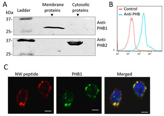 Cell-targeting peptides, including penetrating peptides, are a group of small peptides that can bind and translocate into specific cell types [16,17,18,19]. As such, they are particularly appropriate for the targeted delivery of therapeutics. By the use of random peptide phage libraries, we have isolated a number of short peptides that bind specifically to human monocytes and macrophages, as well as monocyte-derived dendritic cells, when compared to lymphocytes (e.g., T cells, B cells, and NK cells) [20,21]. One of the selected peptides, named NW peptide, was fused to various lytic peptides and shown to kill monocytes/macrophages [22]. This suggests that the receptor(s) of this peptide could be useful target(s) for the delivery of therapeutics to these cells. Although peptides selected from phage display have been used for drug delivery and imaging without knowledge of their cellular receptors, moving any peptide toward clinical use will be facilitated by the understanding of its interaction with target cells, as well as the identification of the cell surface receptor(s). In the present study, we report on the identification of amino acids that are critical for the NW peptide to bind monocytes/macrophages. Moreover, we uncovered membrane-associated prohibitins (PHB) 1 and 2 as the binding receptors.