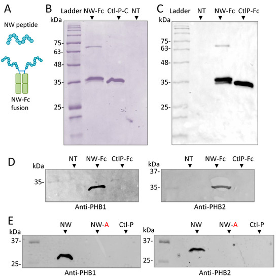 NW peptide interacts with intracellular prohibitins. (A) Schematic illustration of the peptide–Fc fusion construct. (B) The peptide–Fc fusions (NW–Fc and CtlP–Fc) were expressed in HEK293T cells, purified as described in the Section 4, and then analyzed by SDS-PAGE, followed by Coomassie blue staining. Duplicate gels were transferred to nitrocellulose membranes and probed with either anti-human IgG Fc monoclonal antibody (C) or anti-PHB1 or anti-PHB2 monoclonal antibodies (D). NT proteins were prepared from non-transfected cells. (E) Replacement of W with A at positions 2, 6, and 12 (NW-A) inhibited the binding of the NW peptide to prohibitins. Whole-cell protein lysates were incubated with either the wild-type NW peptide (NWYLPWLGTNDW), the alanine-substituted NW peptide (NAYLPALGTNDA), or the control peptide (FYPSYHSTPQRP) and then processed as described for Figure 4A,B. CtlP, control peptide.