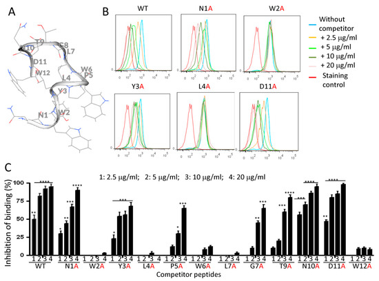 Alanine-scanning mutagenesis is a widely used strategy for identifying peptide residues that are important for function or ligand binding [28]. This method was used to define the primary structural requirements for NW peptide binding to monocytes. Peptide derivatives were synthesized with 1 of the 12 residues of the NW peptide (N1W2Y3L4P5W6L7G8T9N10D11W12) replaced with alanine (Supplemental Table S1). The peptide derivatives were used to compete with the biotinylated wild-type NW peptide for binding to monocytes, as described in the Section 4. Figure 7A,B shows the putative 3D structure of the NW peptide and some representative examples of cytometric histograms showing the inhibition of the NW binding to monocytes by the alanine-substituted peptides. A summary of the percentages of inhibition of the peptide binding at various competitor concentrations is shown in Figure 7C. As expected, the reference wild-type (WT) peptide (unmodified NW peptide) competed effectively with the biotinylated NW peptide to bind monocytes. The replacement of tryptophan (W) at position 2, 6, or 12 by a single alanine abolished the binding. No significant inhibitory effect was seen even at high competitor peptide concentrations (concentration 4 = 20 μg/mL; 200-fold excess of competitor peptides over the biotinylated NW peptide). Likewise, the replacement of leucine (L) at position 4 or 7 with alanine totally inhibited the peptide binding as no competition with the mutant peptides was found. These results indicate that both W and L are essential for the NW peptide binding to its receptor expressed on the surface of monocytes. In contrast, the replacement of asparagine (N) at position 1 or 10 and aspartic acid (D) at position 11 with a single alanine did not affect the binding of the alanine-substituted peptides. Indeed, these mutant peptides effectively competed with the biotinylated NW peptide to bind monocytes and the percentages of inhibition were comparable to that obtained with the reference peptide (WT) (Figure 7C). Position-specific replacement of the other amino acids by alanine reduced but did not eliminate peptide binding.