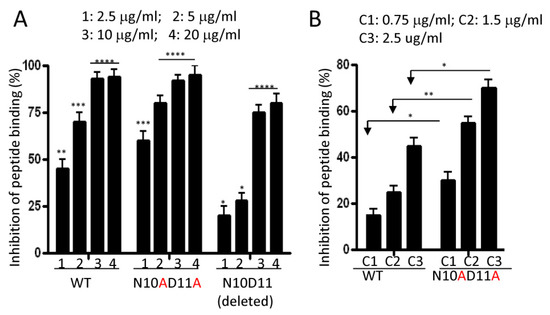 Competition assays. (A) Competition using peptides with N10D11-modified positions. (B) Comparison of the effectiveness of competitor peptides in inhibiting the binding of the biotinylated NW peptide to monocytes. Different concentrations of competitors were used. Experimental conditions are as in Figure 7. Percentages of inhibition were calculated from the geometric mean fluorescence intensity. Average mean values and SD of three independent experiments are shown. * p < 0.05, ** p < 0.01, *** p < 0.001, and **** p < 0.0002.