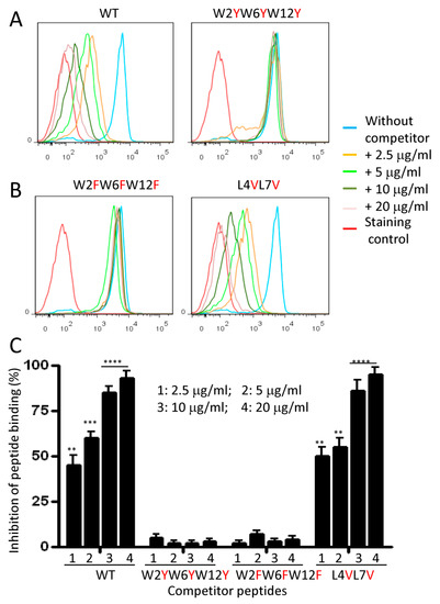 Competition assays using peptides with the neutral replacement of W or L. (A,B) Representative histograms showing the inhibitory effects of tyrosine—(Y)-, phenylalanine—(F)-, or valine—(V)-substituted peptides on the biotinylated NW peptide binding to monocytes. Experimental conditions are as in Figure 7. The reference NW peptide (WT) was included as a positive control. (C) Percentages of inhibition were calculated from the geometric mean fluorescence intensity. Average mean values and SD of three independent experiments are shown. ** p < 0.01, *** p < 0.001, and **** p < 0.0002.