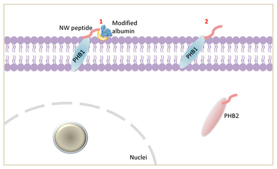 It has been reported that certain viruses exhibit a more complex receptor dependency that involves binding with at least two diverse plasma membrane receptors/proteins. The first receptor allows the virus to attach to the cell surface rapidly, while the second receptor facilitates the virus entry into the intracellular environment, e.g., HIV1, HCV, HSV-1 and -2, adenovirus, and measles virus [42,43,44,45]. Additionally, it has been showed that PHB1 and PHB2 mediate the entry of HCV virus, Dengue-3 virus, Chikungunya virus, and HIV virus into host cells [41,43,46,47]. Based on these observations and the present data, we propose two potential mechanisms for how the NW peptide binds target cells (Figure 10): (1) a model where the binding of the peptide to PHB1 on monocytes or macrophages is facilitated by a potential modified albumin receptor or other factors yet to be identified and (2) a model where the peptide binding only involves surface PHB1. Future studies using PHB1 and PHB2 knockout cells will clarify their roles in NW peptide binding and internalization.