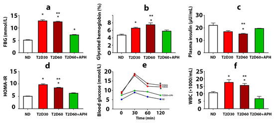 APH-treated diabetic rats demonstrated reduced plasma glucose concentration (7.18 ± 0.19 mmol/L cf. 12.44 ± 0.26 mmol/L in diabetic rats) (Figure 1a). The decline of glycated hemoglobin level testified to the stability of the decrease in glucose level (Figure 1b). APH-treated diabetic rats had an increased level of blood insulin and reduced HOMA-IR parameter cf. rats with T2D (Figure 1c,d). The plasma level of corticosterone did not change (143.98 ± 5.00 pg/mL in APH-treated T2D rats cf. 135.60 ± 6.04 pg/mL in T2D60).