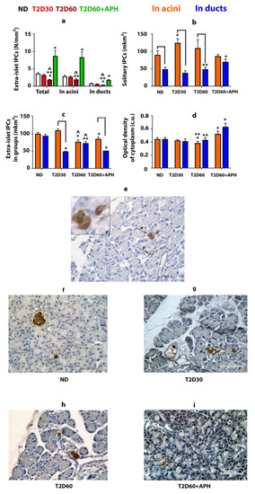 Extra-islet insulin-producing cells (IPCs) in healthy, diabetic, and APH-treated diabetic rats. APH promotes an increase in the number of extra-islet IPCs (a) and the optical density of insulin in them (in conventional units—c.u.) (d) in both acini and ducts. Areas of acinar IPCs are bigger than ductal IPCs, as in the case of solitary located IPCs (b), as in small groups of IPCs (c,e). (e–i)—immunolocalization of insulin in the pancreas of ND (f), T2D30 (g), T2D60 (h), and APH-treated T2D60 (i) rats (brown), light microscopy. e(a)—IPCs in acini, e(b)—IPCs in ducts, e(c)—in acini, enlarged. ND—non-diabetic rats, T2D30—rats with T2D lasts 30 days, T2D60—rats with T2D lasts 60 days, T2D60 + APH—rats with T2D lasts 60 days, treated with APH; n = 10 in each group. Data are mean ± SEM. *—p < 0.05 in comparison with ND; **—p < 0.05 in comparison with T2D60 + APH; ^—p < 0.05 in comparison with T2D30; ⎴ —p < 0.05 between acinar and ductal IPCs.
