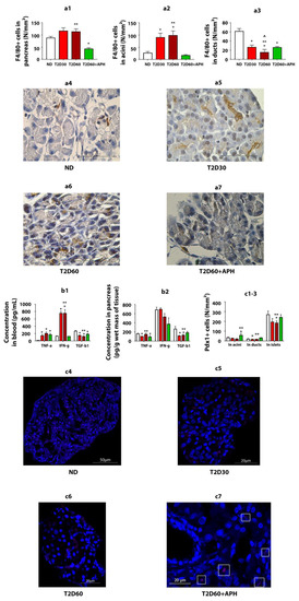 The immunohistochemical analysis of monocyte-/macrophage-derived cells (F4/80+ cells) showed that macrophage infiltration of pancreatic acini increased in T2D (p < 0.05) and decreased in APH-treated diabetic rats (p < 0.05) (Figure 3a1–a3).