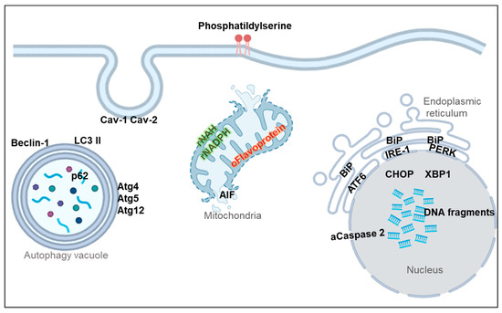 RGC degeneration biomarkers. Picture represents a cell and its organelles; markers are indicated in their preferred location. There are markers directly related to apoptosis such as phosphatidylserine (detected by Anexin V binding), activated caspase 2, or DNA fragmentation (detected by TUNEL, terminal labeling of deoxynucleotidyl transferase dUTP Nick). Mitochondrial dysfunction can be detected by measuring autofluorescence of reduced nicotinamide adenine dinucleotide (NADH) and nicotinamide adenine dinucleotide phosphate (NADPH) or oxidized Flavoproteins or by detecting AIF (apoptosis-inducing factor) release from the mitochondria to the nucleus. RGC degeneration may cause unfolded protein response and endoplasmic reticulum stress, which can be detected by measuring levels or changes in the localization of activating transcription factor 6 (ATF6), inositol requiring protein 1 (IRE1), the protein kinase RNA (PKR)-like ER kinase (PERK), the chaperone binding immunoglobulin protein (BiP) or the transcription factors X-box binding protein 1 (XBP1) and C/EBP homologous protein (CHOP). Changes in autophagy markers are also related to degeneration, markers such as becin-1 or autophagy proteins (Atg4, atg5, or Atg12), the autophagy substrate p62, and the microtubule-associated protein light chain 3 (LC3) II, are largely used as autophagy markers for RGCs. Totally unrelated to apoptosis are the levels of caveolins (Cav1 Cav2) in caveole membrane structures.