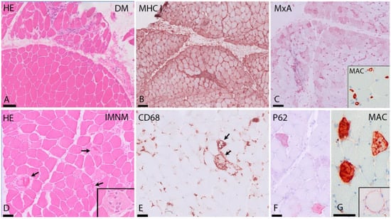 Typical findings in DM and IMNM. (A–C) DM. (A) (H&E staining) shows perifascicular atrophy in DM. (B) MHC I immunostaining shows strong sarcolemmal upregulation in the perifascicular area. (C) MxA immunostaining reveals strong expression on myofibers in the perifascicular area. Insert: MAC (complement C5b9) immunostaining with strong expression in capillaries. (D–G) IMNM. (D) (H&E staining): diffuse necrosis in several muscle fibers in SRP-IMNM (arrows and insert in (A)). (E) CD68+ cells in SRP-IMNM with myophagocytosis of necrotic fibers (arrows). (F) diffuse sarcoplasmic expression of p62 in scattered myofibers in IMNM. (G) MAC immunostaining showing sarcoplasmic and sarcolemmal (insert) MAC deposition in fibers. HE = hematoxylin and eosin stain, DM = dermatomyositis, MHC I = major histocompatibility complex I, MxA = myxovirus-resistance protein A, MAC = membrane attack complex, IMNM = immune-mediated necrotizing myopathy. Scale bar: (A–C) 100 μm; (D–G) 50 μm.