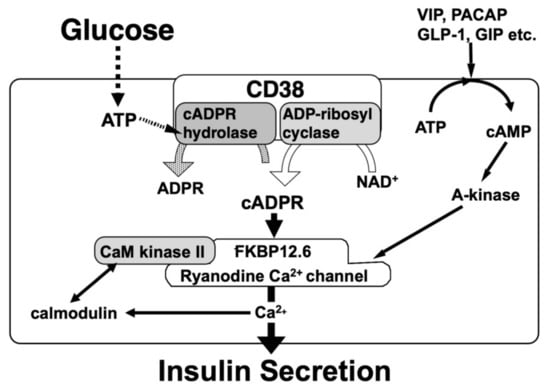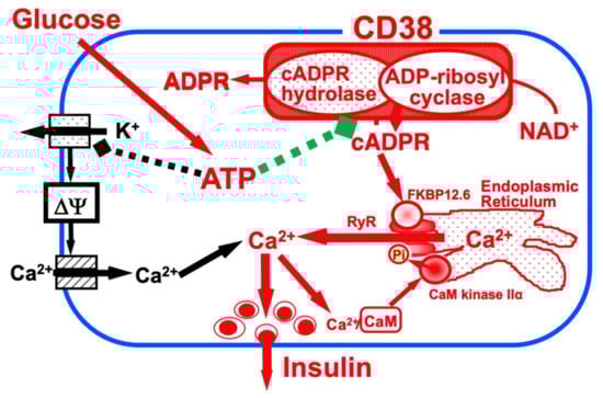 Glucose induces an increase in intracellular Ca2+ concentration in pancreatic islet β-cells and induces the secretion of insulin. Ashcroft et al. first explained the importance of the increase in the Ca2+ concentration in 1984 [16]. The millimolar concentration of ATP is produced by the process of glucose metabolism in pancreatic β-cells. As a result, there is the closure of ATP-sensitive potassium (KATP) channels, which results in membrane depolarization, the influx of Ca2+ through voltage-dependent Ca2+ channels, and an increase in the cytosolic Ca2+ concentration that triggers the exocytosis of insulin granules. In 1993, another model of insulin secretion by glucose via cADPR-mediated Ca2+ mobilization from an intracellular Ca2+ pool, the endoplasmic reticulum, was proposed [12,17], as shown in Figure 1. According to this model, ATP inhibits the cADPR hydrolase of CD38, causing the accumulation of cADPR, which acts as a second messenger for Ca2+ mobilization from the endoplasmic reticulum for insulin secretion [18,19,20,21,22,23,24,25,26,27,28,29,30,31,32,33,34].