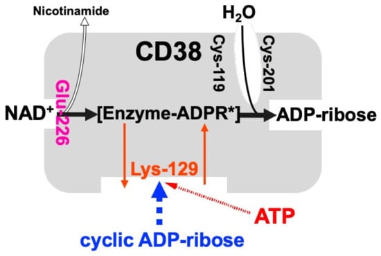 CD38 is a 300-amino-acid protein and was first recognized as a human leukocyte surface antigen. CD38 was found to express in a variety of tissues and cells, including pancreatic β-cells [12,20,44]. We and others have found that CD38 has both ADP-ribosyl cyclase for cADPR synthesis from NAD+ and cADPR hydrolase for the hydrolysis of cADPR to form ADP-ribose [11,12,13,21,45]. Using purified human CD38 protein, it was found that millimolar concentrations of ATP inhibit the cADPR hydrolase activity of CD38, competing with the substrate, cADPR [12,26]. The competitive inhibition of the cADPR hydrolysis by ATP suggests that ATP and cADPR bind to the same site of CD38. We purified human recombinant CD38, incubated with an ATP analogue, 5′-p-fluorosulfonylbenzoyladenosine, and identified the binding site for ATP and/or cADPR as the lysine-129 of CD38 [26]. From these results and other available evidence, we proposed that CD38 catalyzes the formation of cADPR from NAD+ and also the hydrolysis of the cADPR to ADP-ribose. As shown in Figure 2, lysine-129 of CD38 is the cADPR binding site for hydrolysis to ADP-ribose and ATP competes with cADPR in the site, resulting in the inhibition of the hydrolysis of cADPR and then in the accumulation of cADPR by ATP [12,21,34].