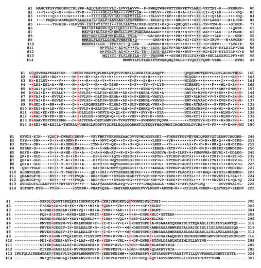 Alignment of the amino acid sequences of the CD38/CD157/ADP-ribosyl cyclase family based on the primary structures of the encoded proteins (adapted from [44]). Dots indicate amino acids identical to human CD38. Dashes indicate gaps for maximal alignment. Ten cysteine and five amino acid residues conserved among all the proteins are highlighted in red and gray, respectively. The underlined amino acid residues are a putative transmembrane domain in CD38 and signal sequence in CD157 and ADP-ribosyl cyclase. The sequences used in alignment are #1: human CD38 (AAA68482 [55]), #2: rat CD38 (BAA06129 [20]), #3: mouse CD38 (AAA03163 [56]), #4: chicken CD38 (NM_001201388), #5: Xenopus laevis CD38 (AB194899 [44]), #6: human BST1 (CD157) (BAA04885 [47]), #7: rat BST1 (CD157) (Q63072 [51]), #8: mouse BST1 (CD157) (BAA06597 [57]), #9: chicken CD157 (NM_001200043), #10: Xenopus laevis CD157 (AB194901 [44]), #11: Aplysia californica ADP-ribosyl cyclase (AAA65698 [8]), #12: Aplysia kurodai ADP-ribosyl cyclase (BAA06284 [9]), #13: Strongylocentrotus purpuratus ADP-ribosyl cyclase (AM494973 [58]), and #14: Schistoma mansoni ADP-ribosyl cyclase (AAX35328 [59]). Although XP_005162637 (Danio rerio ADP-ribosyl cyclase 1-like [60]) showed significant homology with CD38/CD157/ADP-ribosyl cyclase family, the 8th and 10th cysteines in the conserved 10 cysteine residues (red), which are essential for the enzyme activities, are not conserved. It may be important to measure ADP-ribosyl cyclase activity in zebrafish ADP-ribosyl cyclase 1-like for understanding the involvement of the two cysteines in ADP-ribosyl cyclase activity.