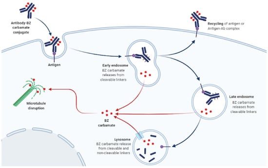 Mechanism of action of benzimidazole (BZ) carbamates targeting tubulin. Tubulin is the leading molecular target of BZ carbamates. They selectively bind to parasitic β-tubulin, promoting their immobilization and death. dapted from “Antibody-Drug Conjugate Drug Release”, by BioRender.com (2022). Retrieved from https://app.biorender.com/biorender-templates, accessed on 10 March 2022.