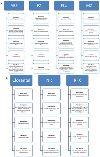 Pharmacokinetic properties and side effects of veterinary antiparasitic drugs. (a) The BZ carbamate drugs are poorly absorbed; have a wide distribution in the body; show extensive hepatic metabolism; and are excreted via feces and urine. (b) The halogenated salicylanilides (HS) antiparasitic drugs show poor absorption, distribution throughout the body, are poorly metabolized and are excreted in bile, feces, or urine.