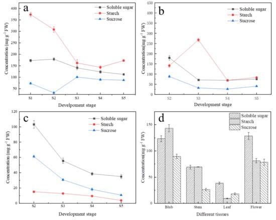 2.1. Variation of Carbohydrate Content during Lily Development in Different Tissues
