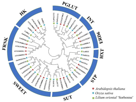 - Johnson, D.A.; Thomas, M.A. The monosaccharide transporter gene family in Arabidopsis and rice: A history of duplications, adaptive evolution, and functional divergence. Mol. Biol. Evol. 2007, 24, 2412–2423. [Google Scholar] [CrossRef]