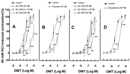 (A,B): Effects of AG1478 ((A) N = 8, 6, 5, and 6 for control, 10−6, 3 × 10−6, and 10−5 M, respectively) and prazosin ((B) N = 5) on dexmedetomidine (DMT)-induced contraction in isolated endothelium-denuded rat aortas. (C): Effect of AG1478 (N = 5) on DMT-induced contraction in isolated endothelium-denuded rat aortas pretreated with prazosin (10−9 M). (D): Effect of rauwolscine (10−6 M, N = 5) on DMT-induced contraction in isolated endothelium-denuded rat aortas. Data are shown as mean ± SD and are expressed as a percentage of isotonic 60 mM KCl-induced contraction. N indicates the number of rats. Control indicates no treatment. * p < 0.05, ** p < 0.01, and *** p < 0.001 versus control.