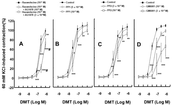(A): Effect of AG1478 (N = 7, 6, and 5 for rauwolscine alone, rauwolscine plus 10−6 M AG1478, and rauwolscine plus 3 × 10−6 M AG1478, respectively) on dexmedetomidine (DMT)-induced contraction in isolated endothelium-denuded rat aortas pretreated with 10−6 M rauwolscine. Data are shown as mean ± SD and are expressed as a percentage of isotonic 60 mM KCl-induced contraction. N indicates the number of rats. ** p < 0.01 and *** p < 0.001 versus rauwolscine alone. # p <0.001 versus 10−6 M rauwolscine plus 10−6 M AG1478. (B–D): Effects of PP1 ((B) N = 6, 5, and 6 for control, 5 × 10−6, and 10−5 M PP1, respectively), PP2 ((C) N = 6, 5, and 6 for control, 3 × 10−6, and 10−5 M PP2, respectively), and GM6001 ((D) N = 5, 5, and 6 for control, 10−5 and 3 × 10−5 M GM6001, respectively) on DMT-induced contraction in isolated endothelium-denuded rat aortas. Data are shown as mean ± SD and are expressed as a percentage of isotonic 60 mM KCl-induced contraction. N indicates the number of rats. Control indicates no treatment. * p < 0.05, ** p < 0.01, and *** p < 0.001 versus control.