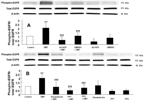 (A): Effects of AG1478 (10−5 M) and GM6001 (3 × 10−5 M) on dexmedetomidine (DMT, 10−6 M)-induced epidermal growth factor receptor (EGFR) phosphorylation (Tyr1068) in rat aortic vascular smooth muscle. Data (N = 6) are shown as mean ± SD. N indicates the number of independent experiments. Control indicates no treatment. * p < 0.05 and *** p < 0.001 versus control. ††† p < 0.01 versus DMT alone. (B): Effects of rauwolscine (10−6 M), PP1 (10−5 M), and PP2 (10−5 M) on the DMT-induced EGFR phosphorylation (Tyr1068) in rat aortic vascular smooth muscle. Data (N = 6) are shown as mean ± SD. N indicates the number of independent experiments. Control indicates no treatment. *** p < 0.001 versus control. ††† p < 0.01 versus DMT alone.